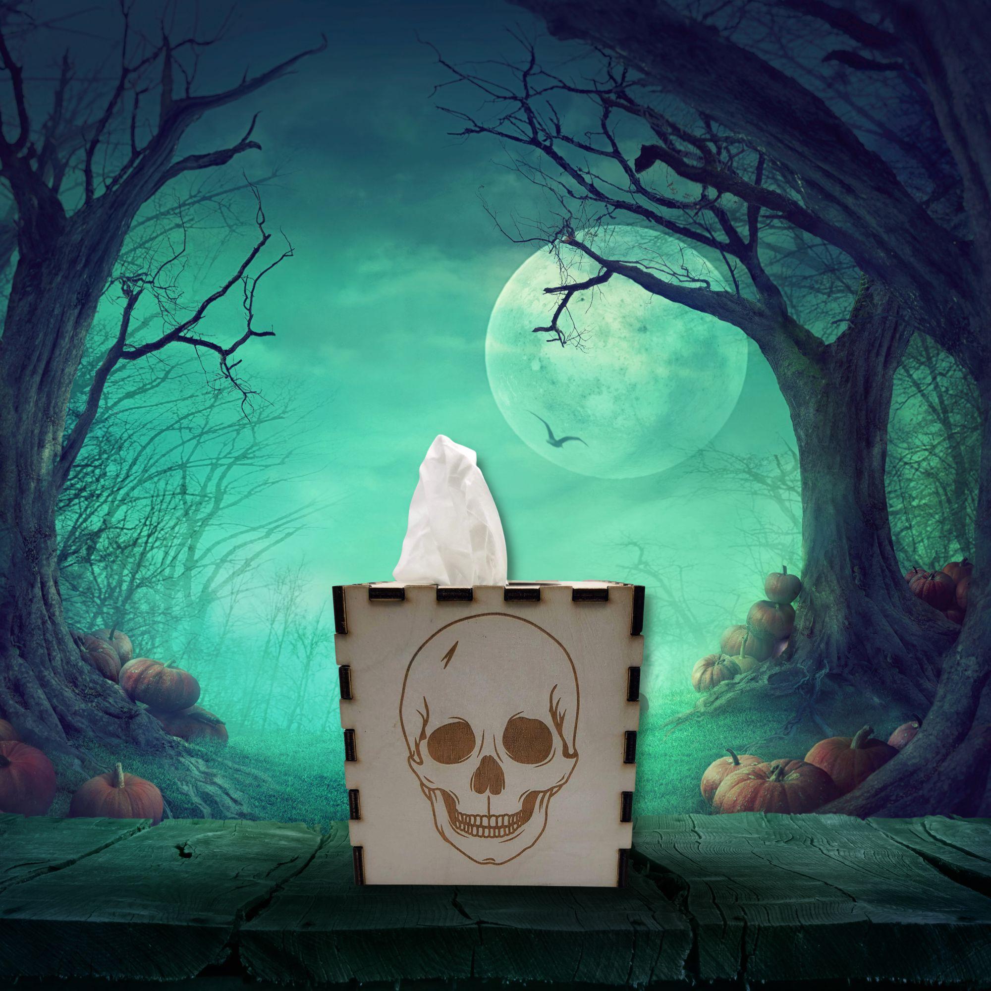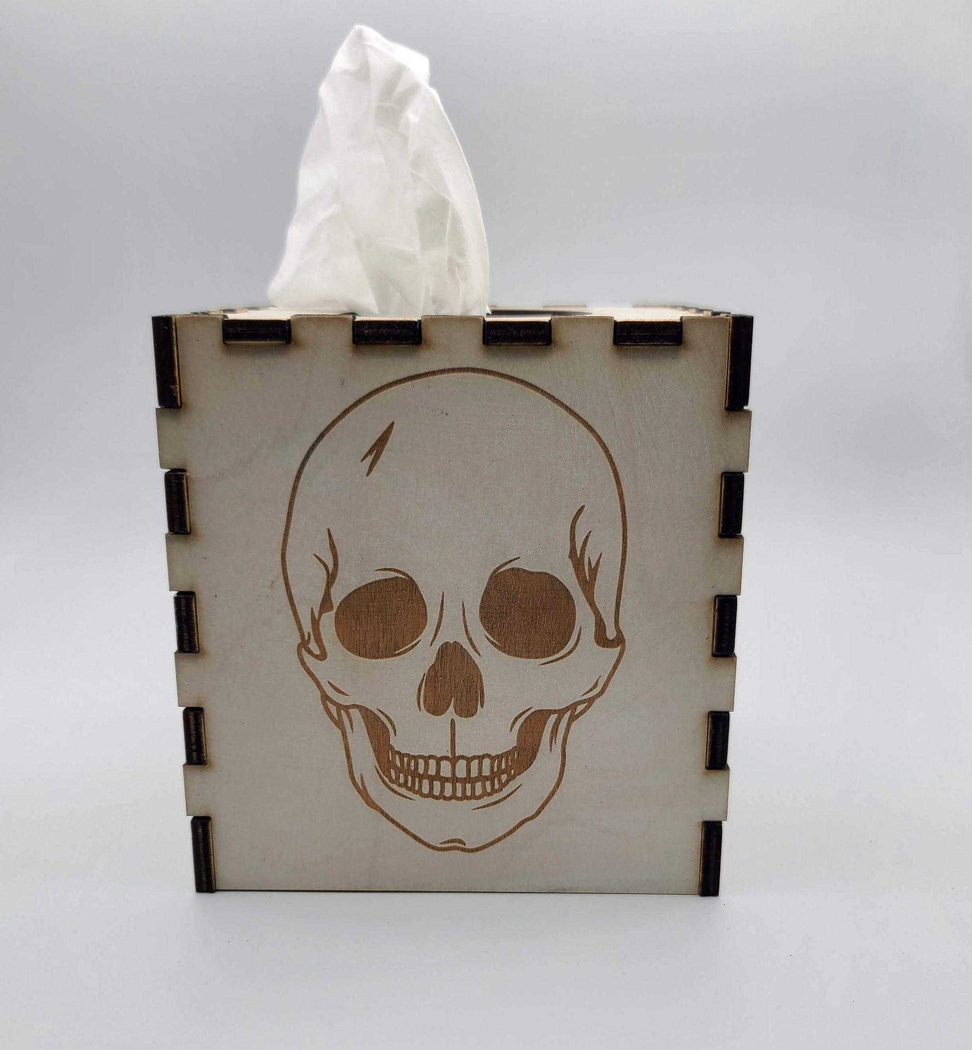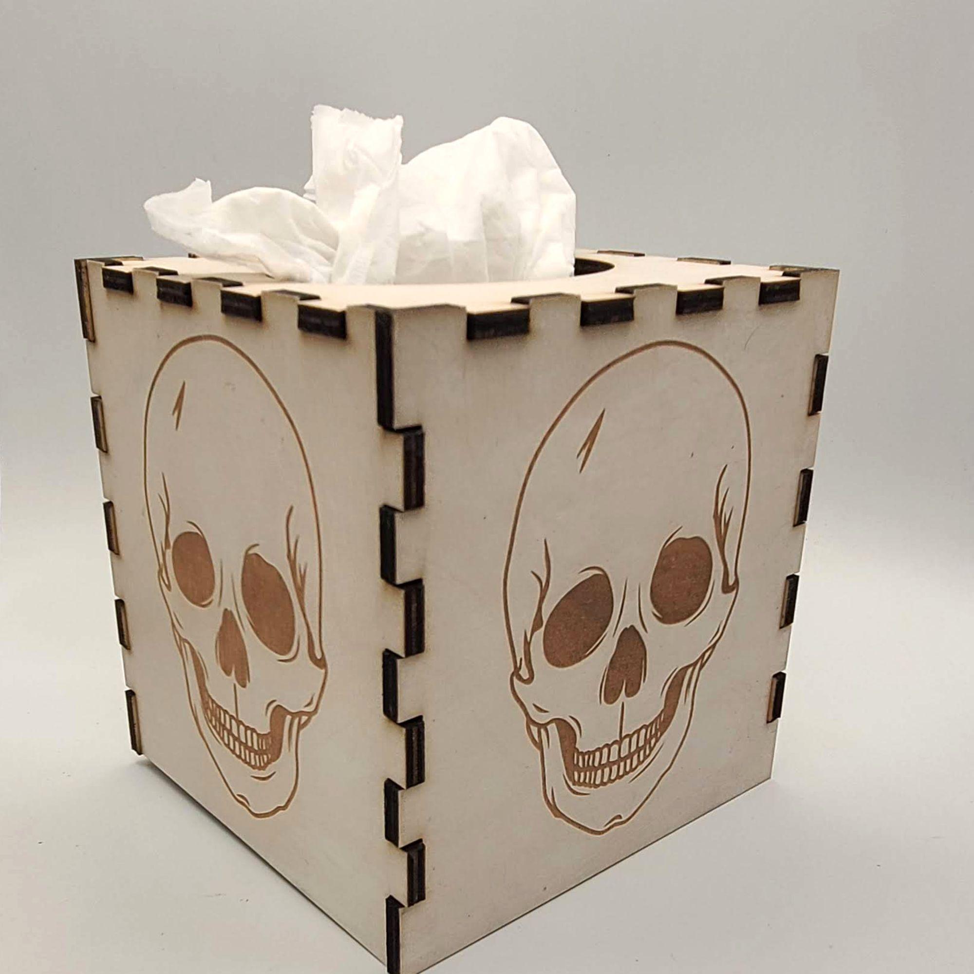 This skull tissue box cover brings the Skull décor to your decorating all year long while seamlessly combining functionality with style! Each side of the tissue box cover is laser engraved with a skull.